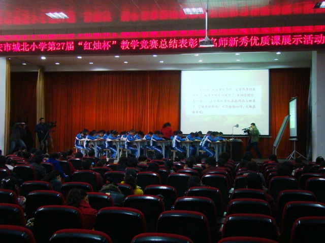 11月28日,赛程第二阶段“总结颁奖暨名师新秀优质课展示”活动在学术报告厅隆重举行。市教研室何鼎友主任、贾斌副主任、小语教研员严仍江老师、小数教研员毛小敏老师、区教育局党委书记鲍传满同志、教研室王东升主任、基教科程静东科长出席本次活动。总结颁奖会上,市、区教育局领导首先为获奖老师代表颁奖,接着,张正好校长致辞,他代表全校师生对莅临观摩指导的领导、专家、老师们表示热烈欢迎,介绍了“红烛杯”大赛开展对中青年教师专业成长的重要意义,回顾了本次大赛中闪现的亮点,他强调本次活动的出发点是“聚焦课堂教学,提高课堂教学实效,深化校本培训,提高教师业务能力。”他表示,要以“创先争优”活动开展为契机,打造学校名师,培养学校文化,实现教师好好学习,学生天天向上,努力办人民满意的教育。