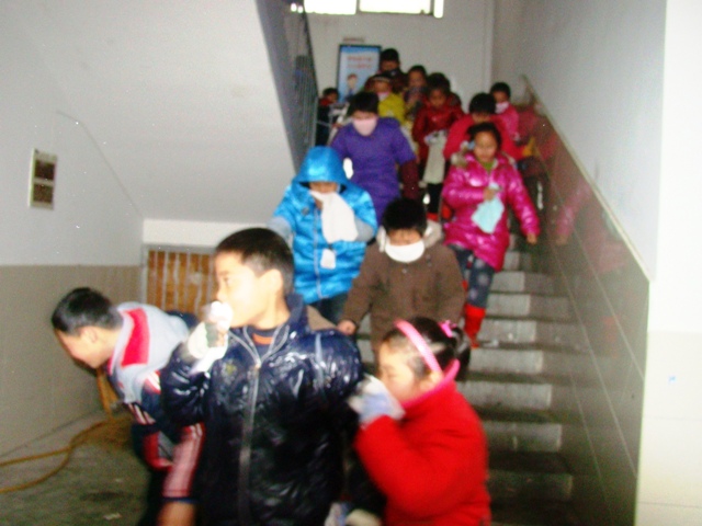 今天上午8:15,总指挥张正好校长一声令下,总控室拉响了警报,各班学生在班主任的指导下迅速冲出教室,师生们用湿毛巾、口罩等捂住口鼻,猫腰从教室撤离,并分别从四个楼梯口撤退,各个楼层的疏散引导组老师密切地关注师生的撤退的情况,指导师生奔向塑胶操场和教学楼北边的空地。撤离集中后各班学生清点人数,向演练指挥中心汇报,确定无人员伤亡。