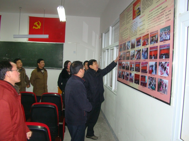区委党建检查组一行7人,区教育局党建检查组一行8人,在区教育局党委书记鲍传满同志的带领下,分别于元月5日、6日下午来我校检查党建工作。他们首先参观了学校的党员活动室、荣誉室,接着听取了学校党支部书记高兰同志和校长张正好同志对党建工作的汇报,然后分组查看党建资料后,检查组对学校的党建工作进行评估。