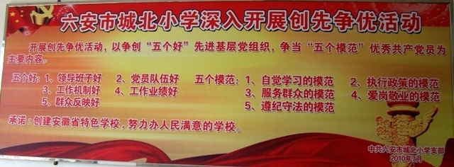 1、结合“创先争优活动”和“学习型党组织建设活动”阶段工作,围绕建党九十周年,开展“立足岗位创先进三尺讲台争优秀”活动。利用校内外媒体、校内广播和橱窗等手段大力宣传先进人物、优秀党员教师先进事迹,努力营造弘扬先进、学习先进的校园氛围。