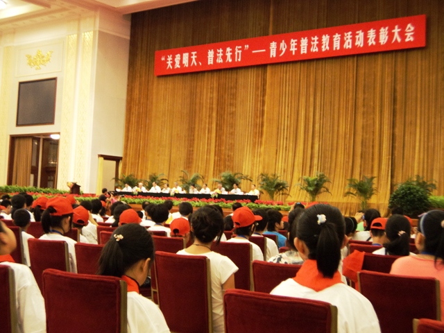 7月26日上午,由中国关工委、司法部、中央综治办联合主办的“关爱明天、普法先行”青少年普法教育活动表彰大会在北京人民大会堂举行。 原全国人大常委会副委员长、中国关工委主任顾秀莲、原全国人大常委副委员长许嘉璐、全国政协副主席张榕明、司法部副部长、中央综治委副主任等领导出席表彰大会并讲话。来自全国22个省、市、自治区(直辖市)的司法、公安、教育、关工委受表彰的代表以及受表彰的师生近2000人参加了表彰大会。