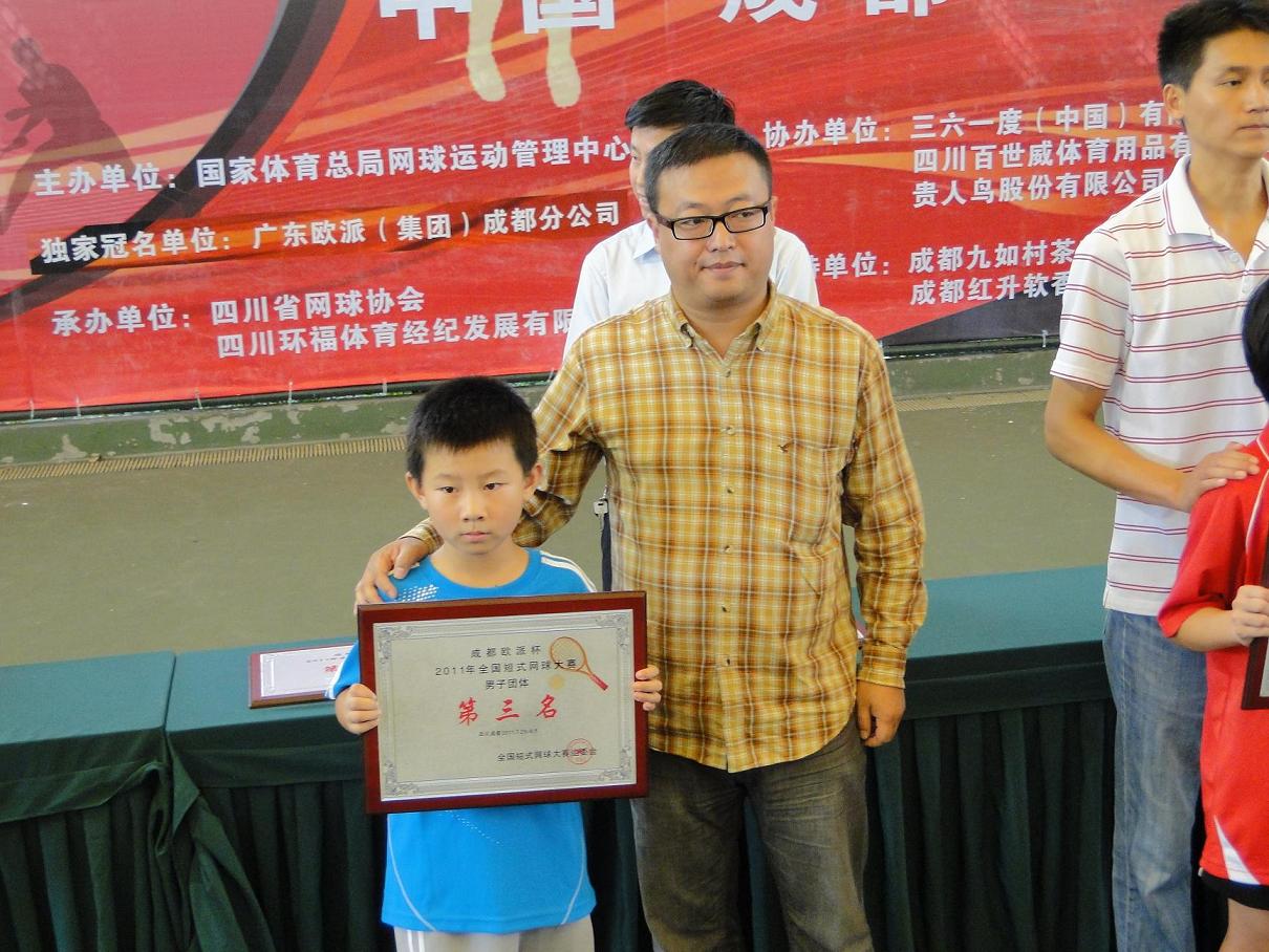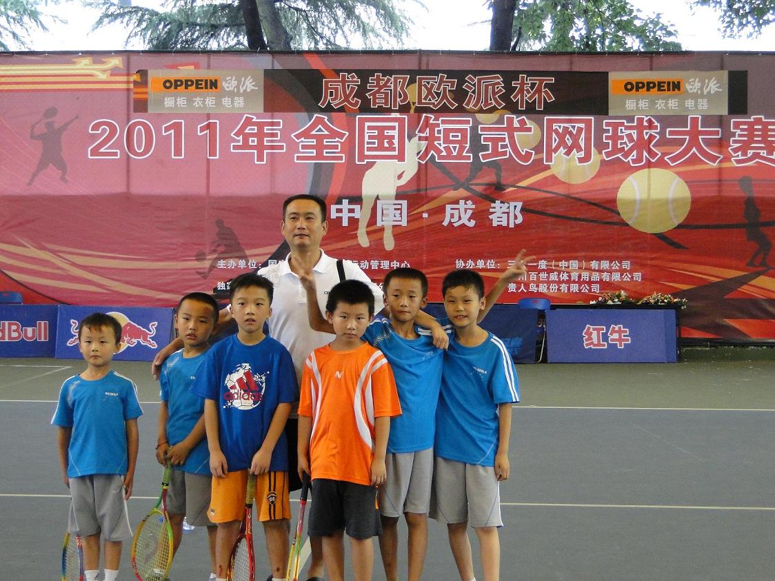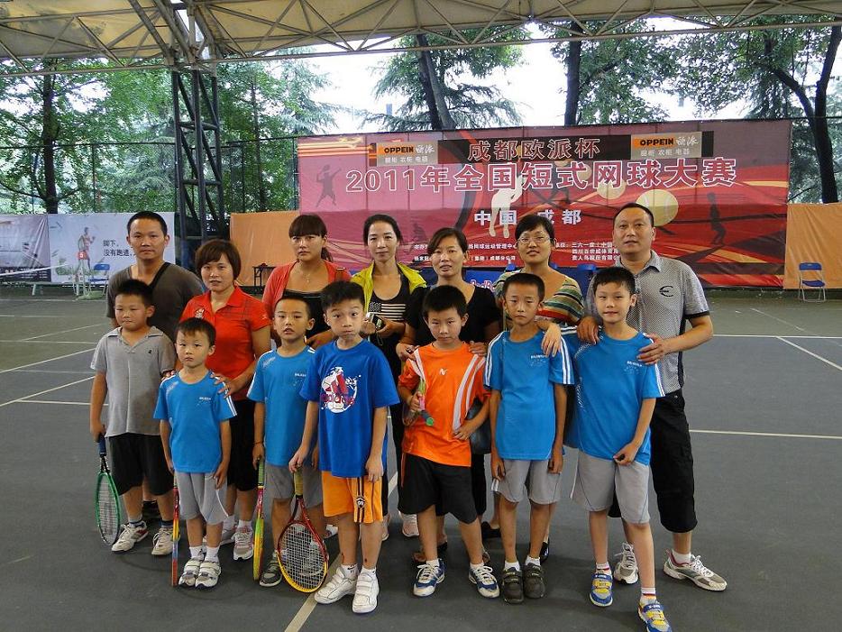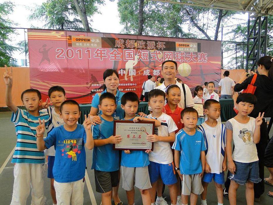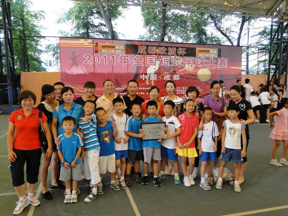 7月31日~8月5日, 由国家体育总局网球运动管理中心主办的2011年全国短式网球大赛在四川成都体育学院拉开帷幕,来自全国各地22个的代表队近200名选手参加了此次比赛,億彩网网球队在领队徐斌,教练员莫少锋、吴红梅、耿军、骆海玲的带领下,14名队员参加了才艺展示、男子团体及A、B、C组网球男女单打、双打、亲子双打等所有项目的比赛。开模式上,莫景行同学还代表参赛运动员宣誓,之后进行的才艺展示,14名队员积极配合,发挥出色,一举夺得唯一的一等奖。在比赛过程中,队员们不断拼搏、进取、团结上进的精神感动了大会组委会领导、裁判员、工作人员及对手和家长们,给大家留下了深刻的印象,最终获得团体第三名(荣尚、王唯易、耿晓澍)和第八名(莫景行、张鑫雨、胡训涛);A组男子双打第四名(荣尚、王唯易)、男子单打第六名(荣尚);B组女子单打第四名(吴荻)、男子单打第七名(胡训涛);C组男子单打第七名等成绩。