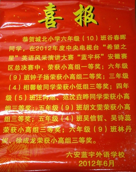 2012年央视“希望之星”英语风采大赛安徽总决赛中,我校选手喜获佳绩!有十位同学喜获大奖。六(10)班谷春晖同学荣获小高组一等奖(六安赛区唯一),六(9)班钟子扬同学荣获小高组二等奖、四(5)班汪冉旭、范沈晔,五(9)班胡文雯,五(4)班吴信哲、吴诗蕊,六(9)班林丹妮、徐成龙同学荣获小高组三等奖,三(4)班相馨敏同学荣获小低组三等奖。