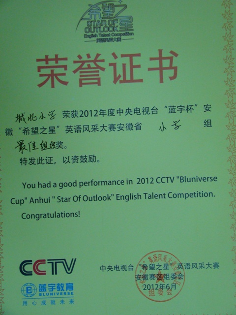 大赛组委会也对我校师生做出了高度评价,我校被授予2012年度中央电视台“蓝宇杯”安徽“希望之星”英语风采大赛安徽省小学组最佳组织奖。希望我校其他学生向他们学习!也预祝十位获奖同学在今后的比赛中再获佳绩!(冯立江)