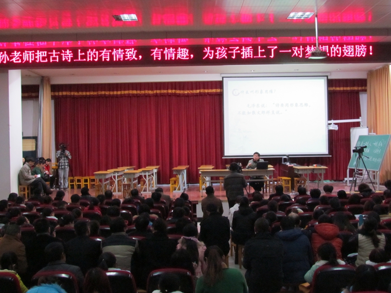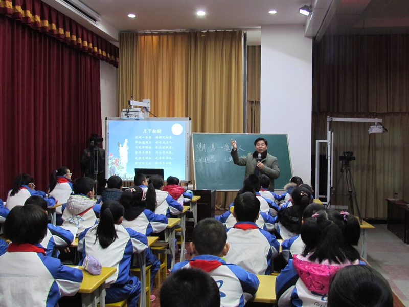 6日上午,在简短介绍与会的领导和专家后,城北小学刘琴老师首先进行了精彩的教学展示,展示了在上月举行的苏教版第五届全国小学语文实验教科书课堂教学大赛荣获特等奖的《大禹治水》一课。接着,全国著名特级教师孙双金老师执教《李白与月亮》。孙老师创造性地将教材内外的内容梳理、整合成“李白与月亮”教学专题。他引领着学生品读了李白的三首诗《古朗月行》《月下独酌》《把酒问月》。孙老师的课堂上,孩子们读诗、品诗、写诗,兴趣盎然,诗情勃发,整个教学过程高潮迭起,精彩不断,如潮水一般,一浪高过一浪。六安的老师们充分领略了孙双金老师情智课堂的独特魅力和迷人的教学风采。正如一位老师在评课信息中写到“孙老师的课堂是幽默风趣、充满魔力的课堂,是情感、智慧和谐共生的课堂,是尽显大家风范的课堂。”课后,孙双金老师声情并茂地做了题为《诗歌与形象思维》的精彩讲座。