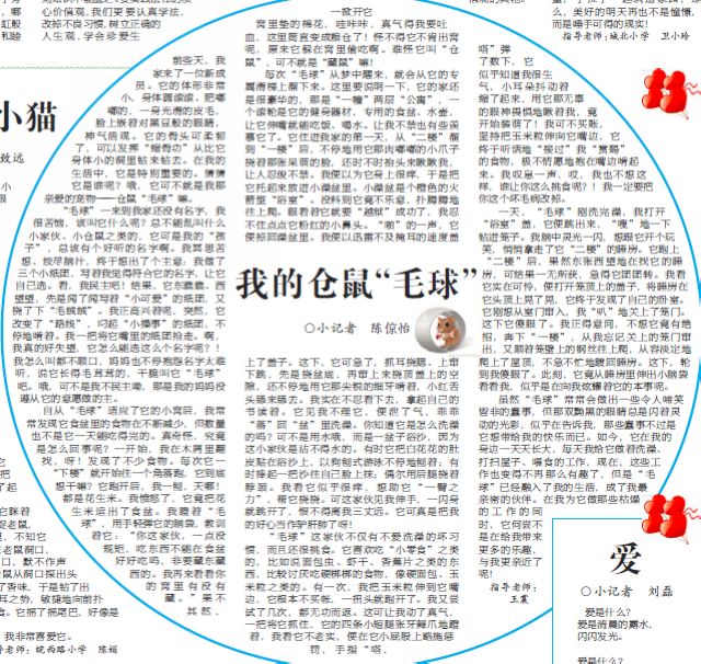 当然,我也是一名兴趣广泛的女孩。我爱在水中游曳的那份自由;更爱在画纸上勾勒五彩线条的那抹意趣;犹爱在书桌旁、草地上与伴随我成长的佳作名篇对话的别样酣畅,关羽、噶玛兰、福尔摩斯、哈利・波特……都是我的神交好友。偶有兴致我会DIY美味的面包、蛋糕,周末早晨给爸妈还有自己准备一顿营养早餐,更会在方格纸上写下我的欢笑悲伤,有时还会到班里与老师同学们分享。我最爱各种各样的小狗,会上网查他们的品种和智商。我虽也希望作业能少些,但每当放假时,又格外想念五(1)班种种搞怪的同学们,我爱五(1)班,爱我们美丽的家园。