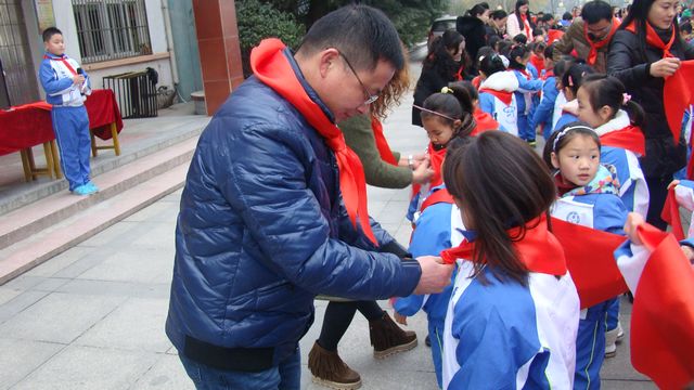 入队仪式上,六年级的老队员为新队员戴上鲜艳的红领巾,新队员在队旗下进行了庄严的宣誓。新队员代表一 ( 1 )班黎章瑶同学,带着稚气的童音表露了全体新队员的心声。张敏副校长对全体少先队员提出了希望和祝福,希望全体队员好好学习、好好锻炼身体,学会做人、学会生存,多为他人着想,多为集体着想。时刻准备着,为红领巾争光添彩!