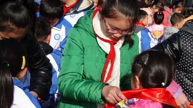 伴随着嘹亮的少先队队歌,一年级120名新队员光荣地加入了中国少年先锋队,老队员为新队员戴上了鲜艳的红领巾。面对队旗,新队员们在少先队大队辅导员的带领下,进行了庄严的宣誓。少先队员们呼出了“时刻准备着”,表达了为共产主义事业贡献力量的决心。鲜艳的红领巾映衬孩子们幸福的笑脸。张耀文同学代表全体新队员表达了能加入到少先队这个大集体的激动自豪的心情。