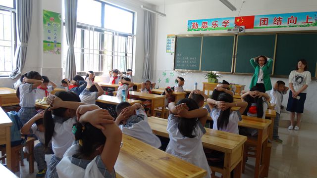 随着一阵急促的警报声响起,全校师生按照既定的“防震应急疏散演练预案”进行抗震演练。整个场面扣人心弦,同学们在老师的指导下,用手护住头和胸,就近或蹲或躲在课桌下,以避开地震开始时的强烈震动。当震感减落,警报声再次响起时,只见同学们双手抱头迅速进行安全撤离,按预定方案进行疏散。整个过程用时不到两分钟,全校师生就安全撤离到指定的操场位置,演练过程秩序井然,达到了预期效果。