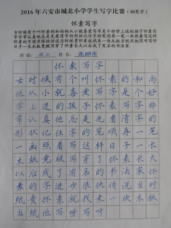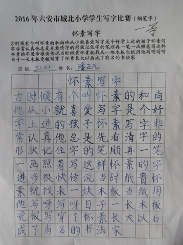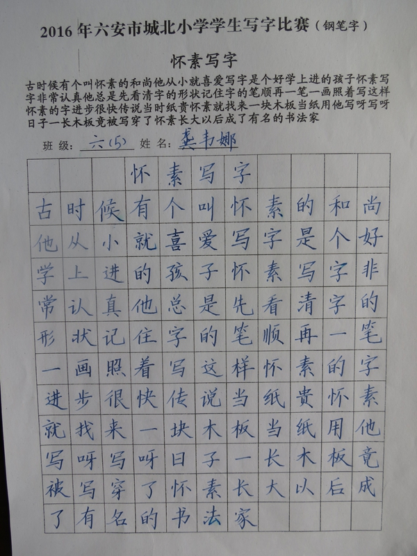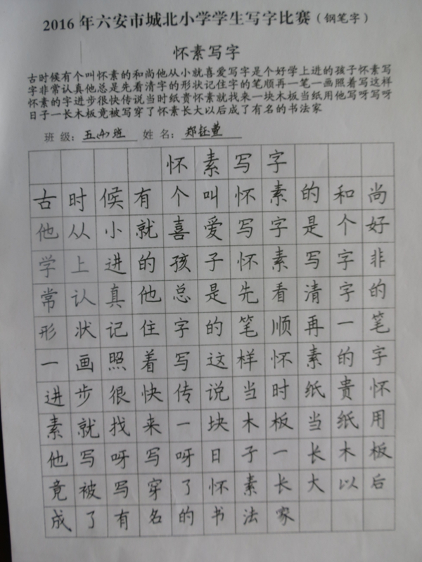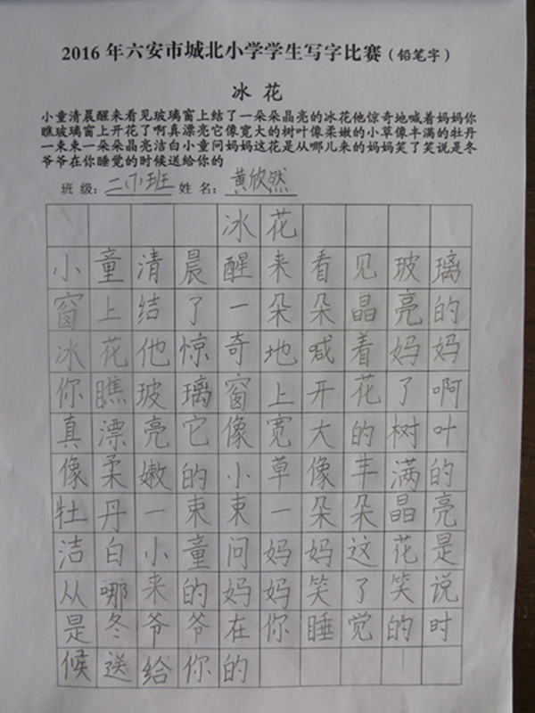 本次活动共有2000余名同学参与,竞赛内容涉及作文、数学、英语、书法(铅笔字、钢笔字、毛笔字),内容既丰富多彩又富有情趣。竞赛按年级设奖,分学科依次进行。小选手们赛前精心准备,认真备战;比赛时沉着细心,认真投入,努力发挥自己的最好水平,既巩固了学科知识,又培养了动手、动脑能力。竞赛活动的成功举行为即将到来的节日增添了浓浓的欢乐气氛!