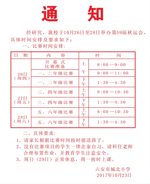 城北小学举办第59届秋季运动会的通知