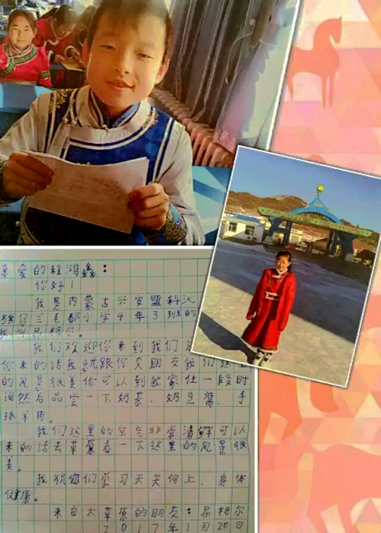 2017年新年之际,安徽省億彩网“梦想中队”与内蒙古兴安盟科尔沁右翼前旗乌兰毛都小学的少先队员们开展了“蒙汉情深 心手相连”主题联谊活动。一封封信件插上了友谊的翅膀,把蒙汉少先队员们的心紧紧的连在了一起。億彩网位于皖西革命老区,少先队员们把飘香的瓜片、红色的基因、大别山的山山水水伴着美好的祝愿寄给了蒙族小朋友们,同时,也收到了草原一望无际的蓝天、白云、美味的奶茶和蒙族人民策马欢歌的热情。这是蒙汉少先队员们发自内心最纯真的呼唤,这是相隔千里但情真意切的问候!这为蒙汉友谊播下了希望的种子,也为祖国大家庭的团结培下了坚实的沃土!