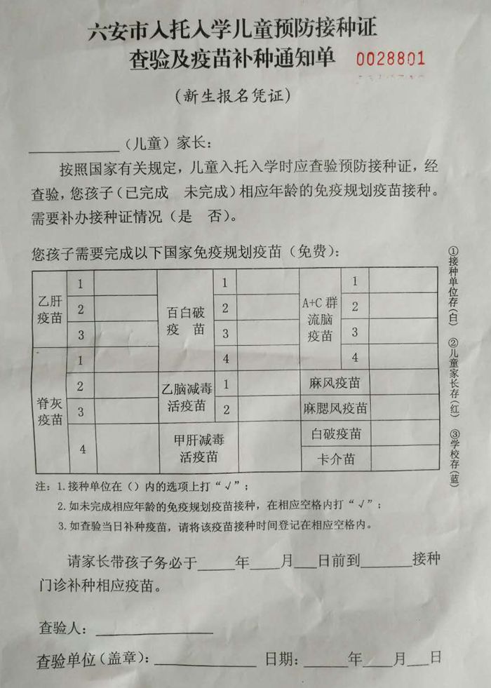 根据8月14日下午区教育局、卫计委、疾病防控中心联合召开的最新会议要求,城北小学西校区一年新生报名除持原学校招生公告上所需要的证件外,还需要提供当地卫生部门出示的查验补种通知单(见下图通知和表样)。