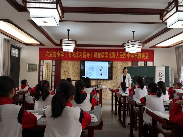 上午是三节《书法练习指导》优秀课例展示。第一节课是本次比赛一等奖获得者霍邱城关中心小学王军老师展示获奖优秀课例六下教材《欧阳询楷书结构(二)》;第二节课是一等奖获得者金安人民路小学方昌玉老师展示获奖优秀课例三下教材《竖弯钩》教学;第三节课是衢州市柯城区大成小学名师姜中华应邀精彩展示五年级《集字临摹练习(二)》教学。