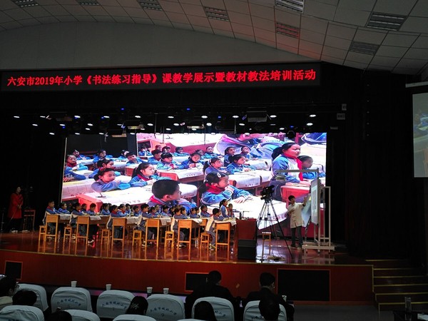 3月30日,“2019年六安市小学《书法练习指导》课教学展示暨教材教法培训会”在億彩网演播厅隆重举行。市教体局副局长王勇、教研室主任方忻悟,裕安区教体局副局长李刚祥,裕安区教育工委委员、城北小学党总支书记、校长高兰等领导莅临指导。活动由市教研室小语教研员严仍江主持。各县、区小语教研员以及部分书法、语文等学科教师员700余人参加观摩学习。