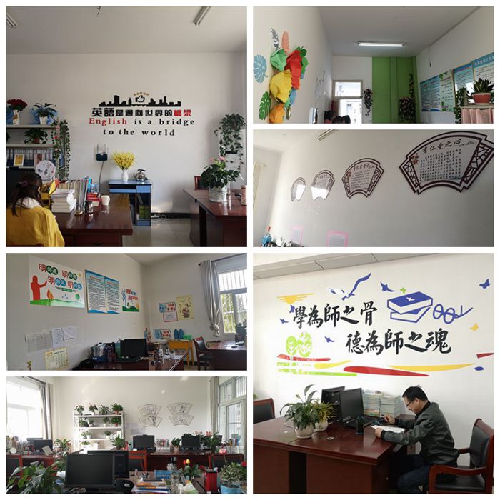 全校各办公室卫生打扫彻底,窗明几净。有的办公室,合理利用空间,使小办公室有了大空间,办公桌上购置了统一书架,办公物品摆放整齐划一。有的办公室墙上悬挂着全体办公室成员的“全家福”照片,办公室里还有仪表镜,温馨而有归属感。有的办公室墙面装饰彰显了学科特点,简约美观,让人印象深刻。有的办公室读书和教研氛围浓厚;有的办公室注重内容与形式的结合。其中五年级(3)办公室布置简洁、整齐、美观,墙上张贴有“四有好老师”标语,突出办公室文化特色和艺术品味;六年级(1) 办公室的“墙文化”设计有特色,“学为师之骨,德为师之魂”大幅标语装饰墙面;一年级(1)办公室飘满花香、书香、墨香,文化气息浓厚。