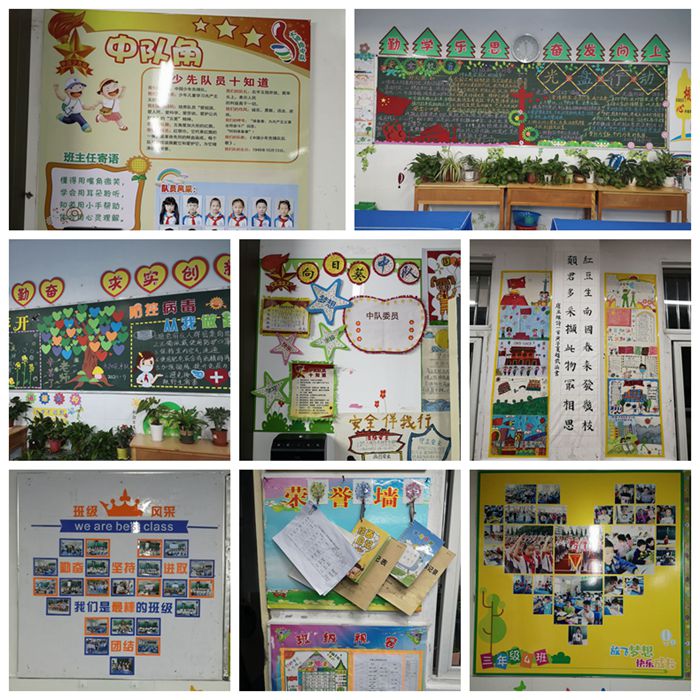 各教室规定栏目齐备,《小学生守则》、《眼保健操示意图》、《点名册》、《班级日志》、《班级公约》、《课程表》、《作息表》等一应俱全。很多班主任精心设计将班务栏做成抽插式,教室布置有特色、有个性:让班级的墙成为会说话的宣传窗口,让教室内的每一个角落都具有教育作用,彰显班集体特色。很多班级的中队角、阅读角、植物角、卫生角、书画作业展、低年级的学生自我介绍、高年级的成长足迹都做到图文并茂、富有新意。教室不仅干净整洁,而且充满着书香、墨香、花香,为学生创造健康、高雅的学习环境。