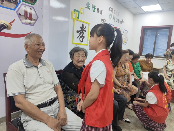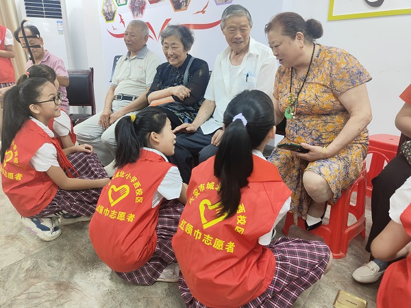 少先队员们为了更深入地了解老人、关心老人,与老人们促膝交谈,通过拉家常的方式,了解他们的身体及生活状况,走进老人们的实际生活,关心老人的内心世界,活动现场气氛活跃。