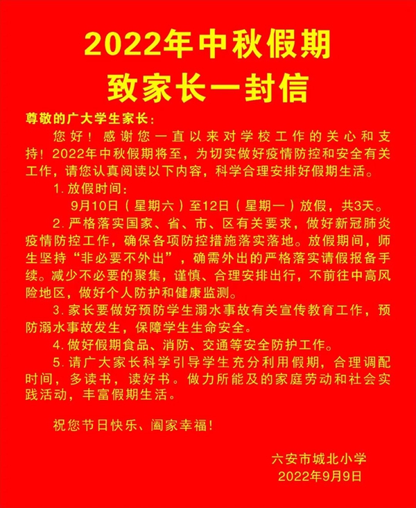 您好!感谢您一直以来对学校工作的关心和支持!2022年中秋假期将至,为切实做好疫情防控和安全有关工作,请您认真阅读以下内容,科学合理安排好假期生活。