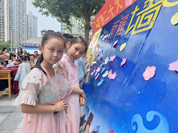 9月9日清晨,步入校园,映入眼帘的是四块醒目的展板,它们分别对应着四项活动:祈福,猜灯谜,点茶,做月饼。上午十时许,一个个身着传统汉服的孩子们依次参与了四项活动。孩子们笑靥如花,浓浓的节日气息扑面而来。师生们为幸福的生活祈福,写下了心中的祝福,表达了深情。