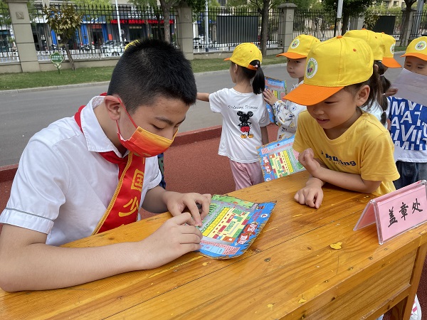 看,这就是“萌娃寻宝图”,图中有好几处打卡地,每到一处,大队委的大哥哥大姐姐们都跟他们热情的打招呼,并跟他们进行详细的讲解,盖上一个鲜艳的印章。