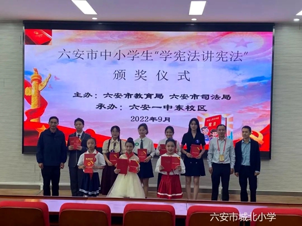 为深入学习宣传贯彻习近平法治思想,全面贯彻落实党的十九大和十九届历次会议精神,紧密结合“八五”普法规划,深入开展法治宣传教育活动,增强学生的宪法意识和法治素养,同时以丰富的形式迎接党的二十大胜利召开,9月25日,六安市第七届中小学“学宪法 讲宪法”系列比赛在六安一中东校区隆重举行。億彩网四(10)中队金术炜同学荣获演讲比赛一等奖第一名,五(8)中队范思彤同学荣获知识竞赛一等奖第二名。