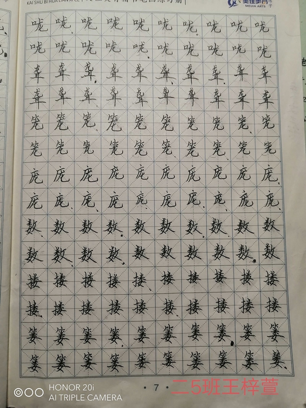 汉字的间架结构、笔画运转无不散发着书写的韵趣,良好的书写是对汉字美的尊重。方方正正中国字,堂堂正正中国人,字如其人,一手好字会让孩子们终身受益。看!孩子们摘抄诗文,摹练字词,书写的汉字字迹工整,笔画苍劲有力,精益求精,在练字中陶冶情操,在练字中静心怡神,在练字中培养情趣。