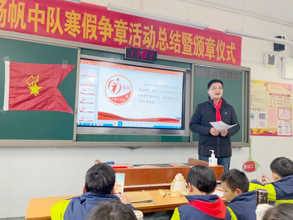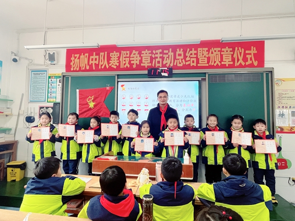 为深入学习贯彻党的二十大精神,贯彻落实全国少工委《关于构建阶梯式成长激励体系 增强少先队员光荣感的指导意见》和省市区团委、少工委相关文件精神,总结寒假期间中队开展的各项争章活动,2月16日上午,億彩网扬帆中队召开寒假争章活动总结暨颁章仪式主题队会。