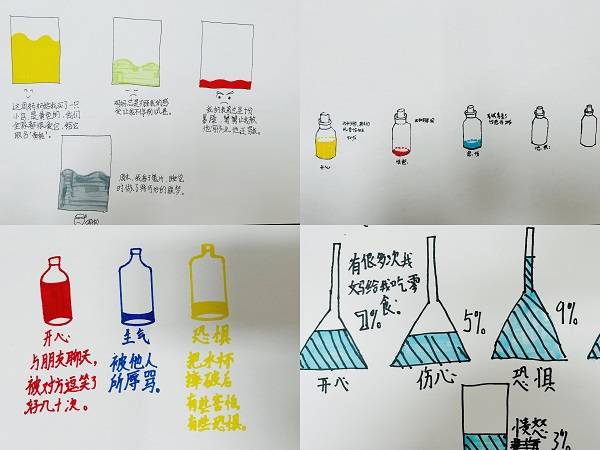 王玮老师以《情绪的认知与转化》为主题上了一堂趣味盎然而又贴近孩子心灵的心理健康课。在课程中,通过观看视频、游戏互动等方式对情绪含义进行了探索,让同学们认识了快乐、悲伤、愤怒、恐惧、焦虑五种情绪,明白情绪没有好坏是自我真实生活状态的一种反映,我们要积极勇敢地面对。在“心情记录瓶”这个环节,很多同学还通过绘画的形式分享了最近一周自己的情绪变化,尝试学会接纳并表达日常学习和生活中遇到的情绪问题。