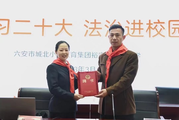 活动由河西小学德育处副主任姚佳佳主持,五年级学生齐聚报告厅,聆听讲座,受益匪浅。首先,河西小学优秀少先队员代表向各位领导敬献了红领巾,副校长郑文丰为六安市裕安区检察院华斌同志颁发了法治副校长聘书。