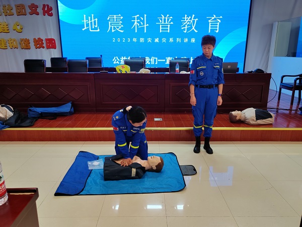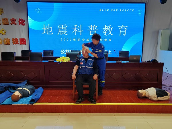 紧接着,六安市蓝天救援队的志愿者现场利用实物演示包扎、心肺复苏等应急救护示范。通过宣传、示范,提升自救互救能力,增强应急避险意识。