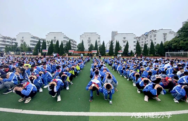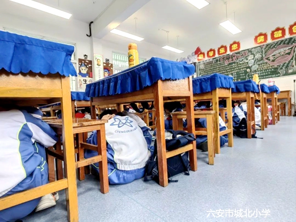 5月11日上午八点二十整,第一次警报声响起,各班学生迅速双手抱头,就近躲在课桌下方,进行紧急避险。随后,第二声警报声响起,各班学生在老师的组织下,按照安全疏散路线撤离到学校操场等指定区域。到达指定的区域后,各班班主任清点并报告人数。整个演练过程紧张有序、快而不乱。