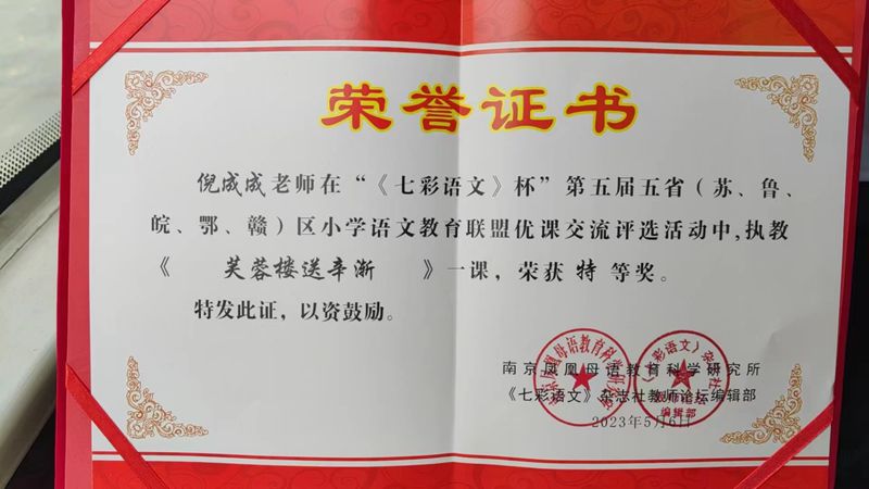 2023年5月4日―6日,在刚刚结束的华东五省区小语教育联盟优课交流评选活动中,代表安徽省六安市参赛的六安市陈明珩名师工作室成员倪成成老师在来自五省区的参赛老师中脱颖而出,荣获特等奖第一名。