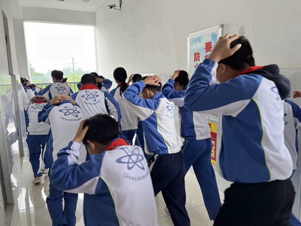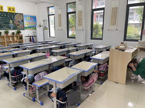 为了确保演练活动的安全有效,学校在演练前制定了详细的工作方案。5月11日上午9点疏散演练正式开始。急促的警报声在校园内响起,各班老师指挥学生就近躲避,迅速蹲在坚固的桌子下,用双手或者书包护住头部。第二声警报响起,各班老师立即组织学生用手抱头、弯腰低身,沿着指定的疏散路线,快速有序地撤离教学楼,仅用了短短3分多钟,全体师生全部安全撤离到操场上。整个演练过程有条不紊按活动方案进行,各班老师在演练过程中,始终密切关注学生安全;各教学楼各层楼梯安全员老师也十分认真负责,引导学生撤离到指定位置,助力疏散演练活动快速、平稳、顺利地进行。