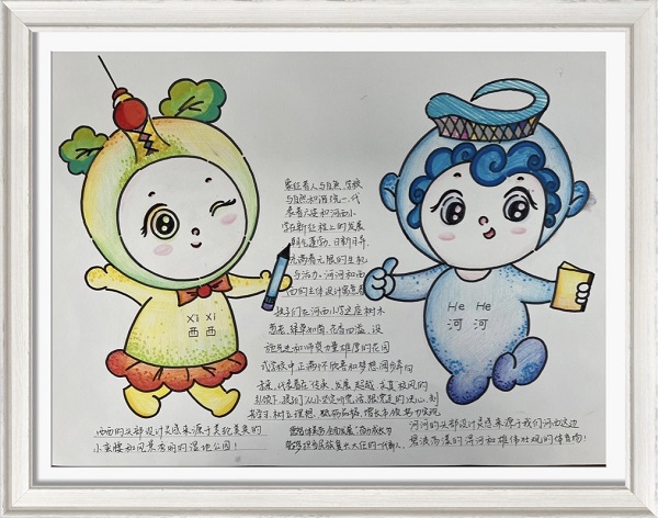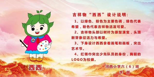 设计说明:“河河”意为“和和”,表示和谐团结,积极进取,奋力拼搏,似彩虹般精彩。 “西西”意为“嘻嘻”,表示乐观豁达,敢于表现自己的特点,乐于助人。“予人玫瑰,手有余香“,帮助他人,快乐了自己。