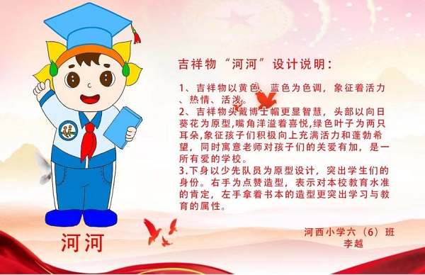 河河和西西的主体设计寓意是孩子们在河西小学这座树木葱茏、绿草如茵、花香四溢、设施先进和师资力量雄厚的花园式学校中,正满怀欣喜和梦想阔步奔向未来。
