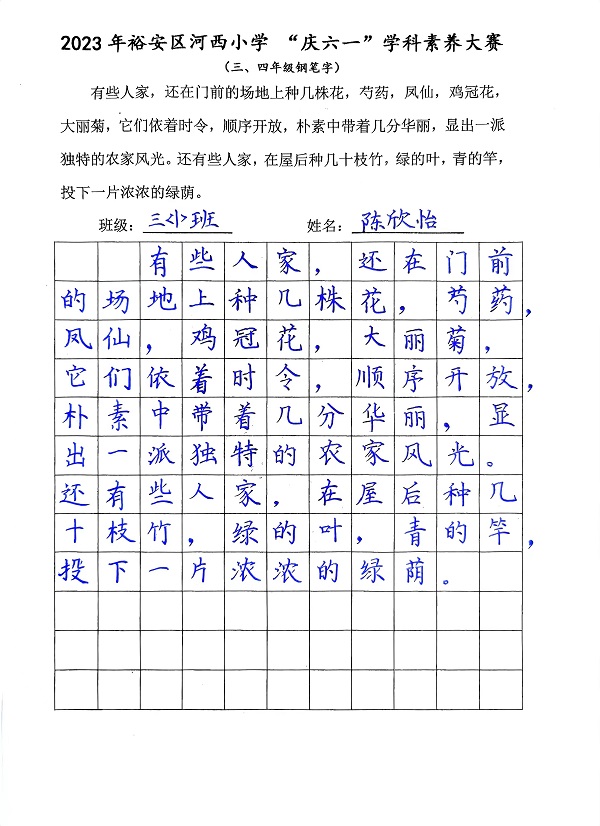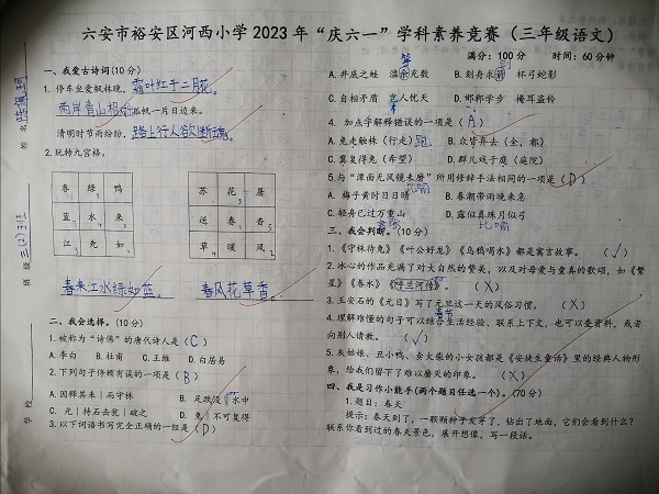 语文素养竞赛涉及古诗词、文学常识、阅读积累、习作表达等,内容丰富、形式多样,既关注表达,也注重思维的提升和优秀传统文化的熏陶。小选手们静心思考、用心作答。他们时而奋笔疾书,时而眉头紧皱,时而眉飞色舞,完全沉浸在其中,享受着比赛的快乐,收获着成长的酸甜。