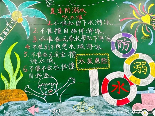 开展防溺水主题黑板报设计。5月中下旬,在六一国际儿童节来临之际,为进一步加强防溺水安全知识宣传,提高学生对防溺水安全问题的关注与重视,学校组织开展了“防溺水安全教育”主题黑板报设计活动。各中队紧紧围绕主题,通过阅读安全教育教材、上网查找资料等方式,自主设计、精心排版,创作出一块块丰富多彩黑板报,内容包括防溺水“六不准”、安全监管四知道、防溺水歌谣、识别危险水域、自护自救的方法等。