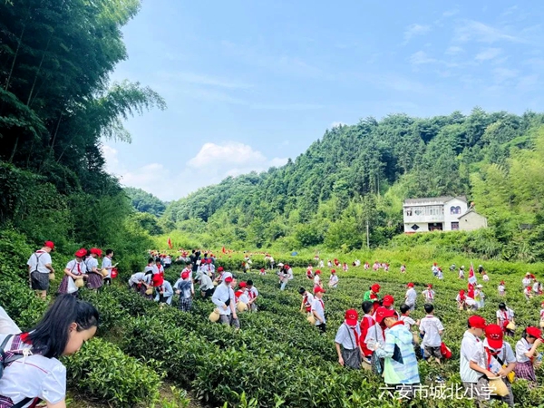 从古丝绸之路到茶马古道,再到一带一路,茶成为中华传统文化不可或缺的重要载体。中国是茶的故乡,六安更是名茶故里,研学之旅第一站便来到位于霍山县与儿街镇的凡冲茶海。在这里,队员们纷纷化身“小茶农”,背着茶篓,穿梭在茶田间,品嗅茶树的清香,抚摸茶芽的青绿,学习采摘的技巧,体验采茶的艰辛与不易。