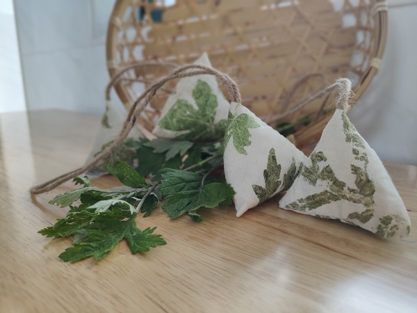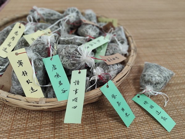 接着将画好、染好的布料,做成香囊,香囊中装入之前搓好的艾绒。瞧!一个个精致小巧、清香扑鼻的端午香囊就做好了。