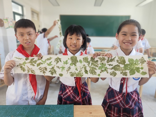 郁郁葱葱的艾叶,香气四溢,为了把大自然的这份美好永久保存,学生们利用非遗敲拓染将艾叶敲染在布上,拼摆、粘贴、敲击,在小组合作下,充满自然气息的艾草花布就染好了。