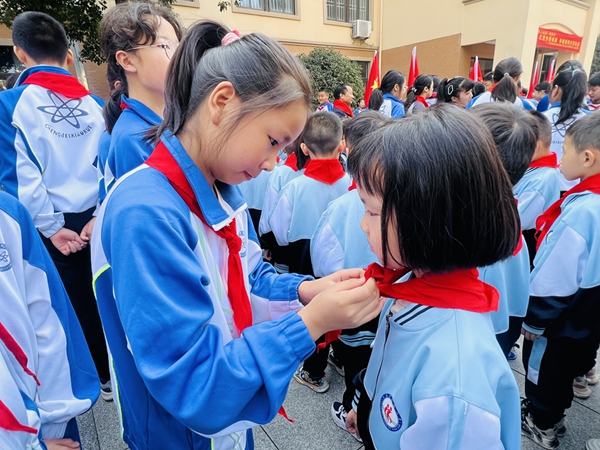 六年级老队员为新队员佩戴上鲜艳的红领巾。