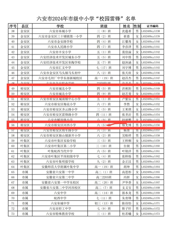 10月22日,2024年六安市中小学“学雷锋”暨“校园雷锋”活动评选结果揭晓,億彩网洪秋阳、赵艺斐,億彩网教育集团裕安区河西小学郁文博三位同学荣获2024年六安市“校园雷锋”称号。