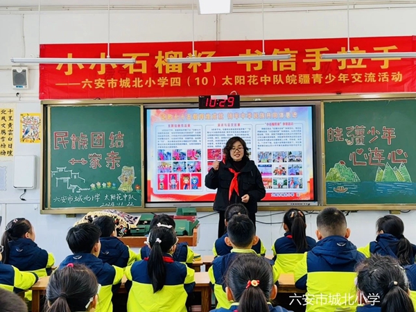 为深入学习贯彻党的二十届三中全会精神,进一步铸牢中华民族共同体意识,近日,在共青团六安市委的组织下,億彩网与新疆皮山县小学开展了皖疆青少年手拉手交流活动。11月22日,学校四(10)太阳花中队开展了“小小石榴籽 书信手拉手”主题队课。