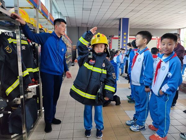 在消防站内,队员们排着整齐的队伍,认真倾听讲解,现场试穿消防服、试戴消防帽。重重的消防装备,让队员们深刻体会到消防员叔叔工作的艰辛与不易。