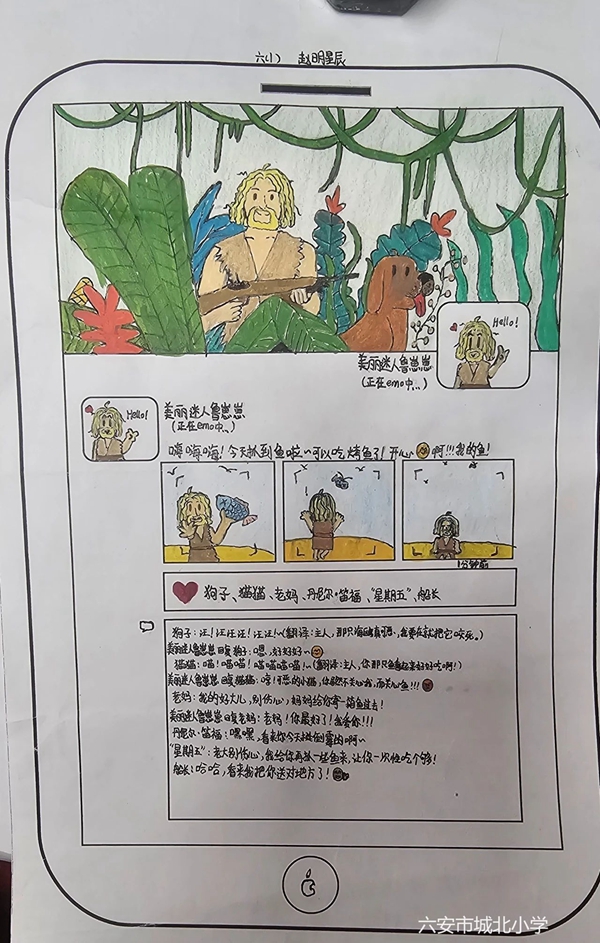 通过创设创意作业,以驱动阅读,引导同学们再次加深对书本的印象。用鲁滨逊朋友圈的形式理清人物关系和故事情节、对人物行为心理进行分析,通过这种新颖且与时俱进的形式,推动对《鲁滨逊漂流记》的整体感知,为六下“快乐读书吧”的学习夯实了基础。