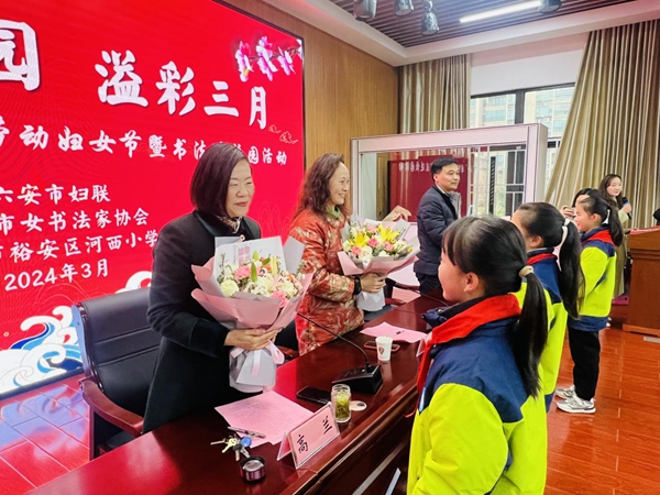 3月5日下午,河西小学报告厅暖意盎然,墨香四溢。六安市妇联宣传部部长汪海蕴,六安市女书法家协会主席邹文定和女书协的专家,裕安区委教育工委委员、億彩网教育集团总校长高兰,河西小学执行校长张仁朋出席了活动。河西小学的少先队员们为莅临本次活动的领导和嘉宾献上了鲜花。