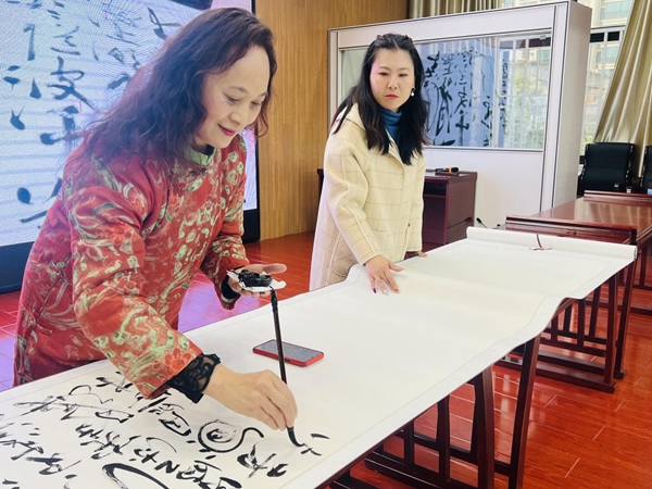 六安市女书法家协会邹文定主席为全体师生现场进行书写展示《春江花月夜》,邹主席笔走龙蛇,带大家领略了草书的魅力,现场发出一阵阵惊叹。女书协专家还带来了祝福小卷轴,送给每一位老师。