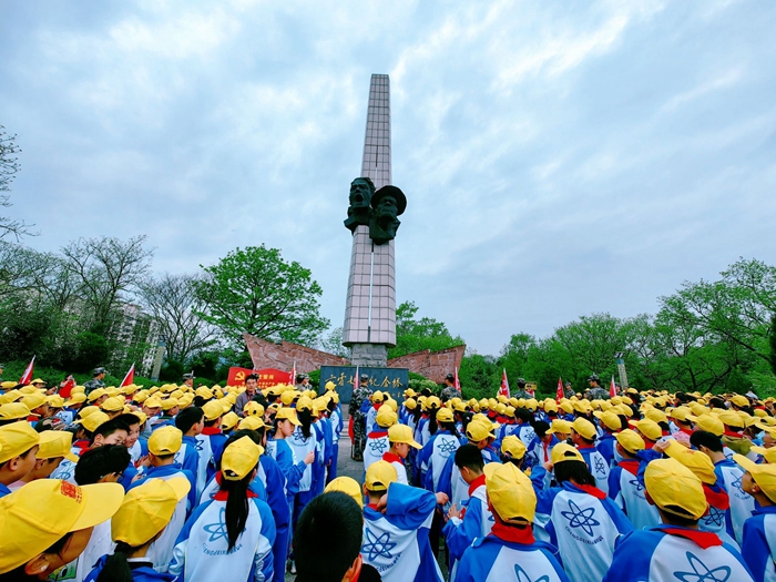 下午2时许,研学队伍在六霍起义纪念塔前一字排开,深情缅怀