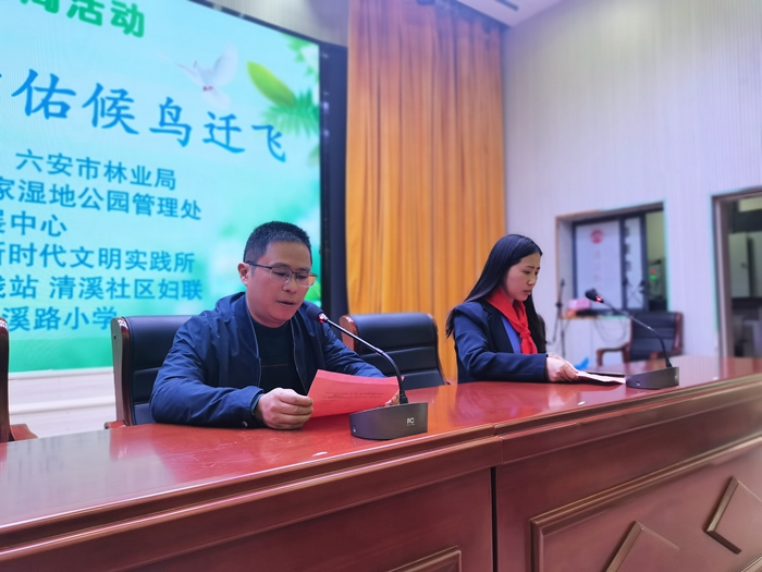 为树立生态文明理念,普及爱鸟护鸟知识,增强学生环保意识,4月10日上午,六安市淠河国家湿地公园管理处专家团队走进億彩网教育集团清溪路小学开展“完善保护体系 护佑候鸟迁飞”主题宣教活动。裕安区林业发展中心相关领导莅临活动现场。活动由清溪路小学德育处副主任严家敏主持。